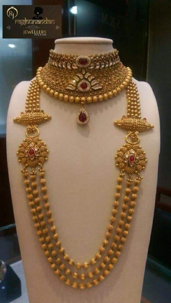 The Rani Haar necklace set symbolizes aristocracy and elegance. It is a long, layered necklace often made with gold, pearls, or kundan. Brides often combine it with chokers or shorter necklaces to create a majestic layered look.